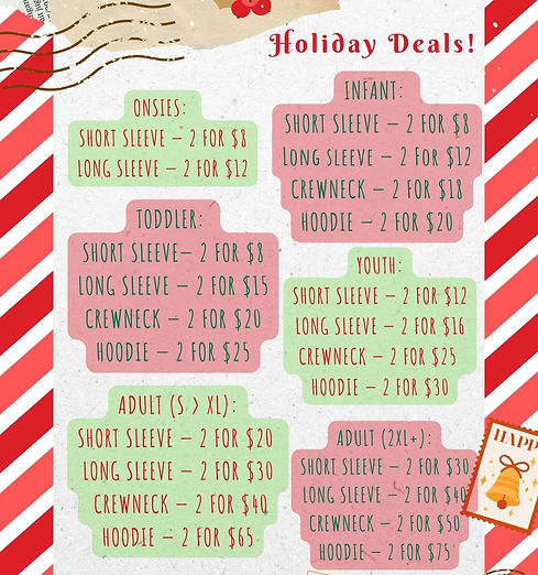 Here you’ll find my original pricing list (no form needed!), along with all the details for items in infant, toddler, youth, adult, and 2XL+ sizes. I’ve kept everything easy to read so you can find exactly what you’re looking for.